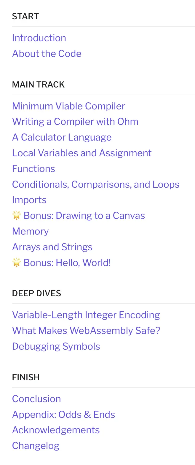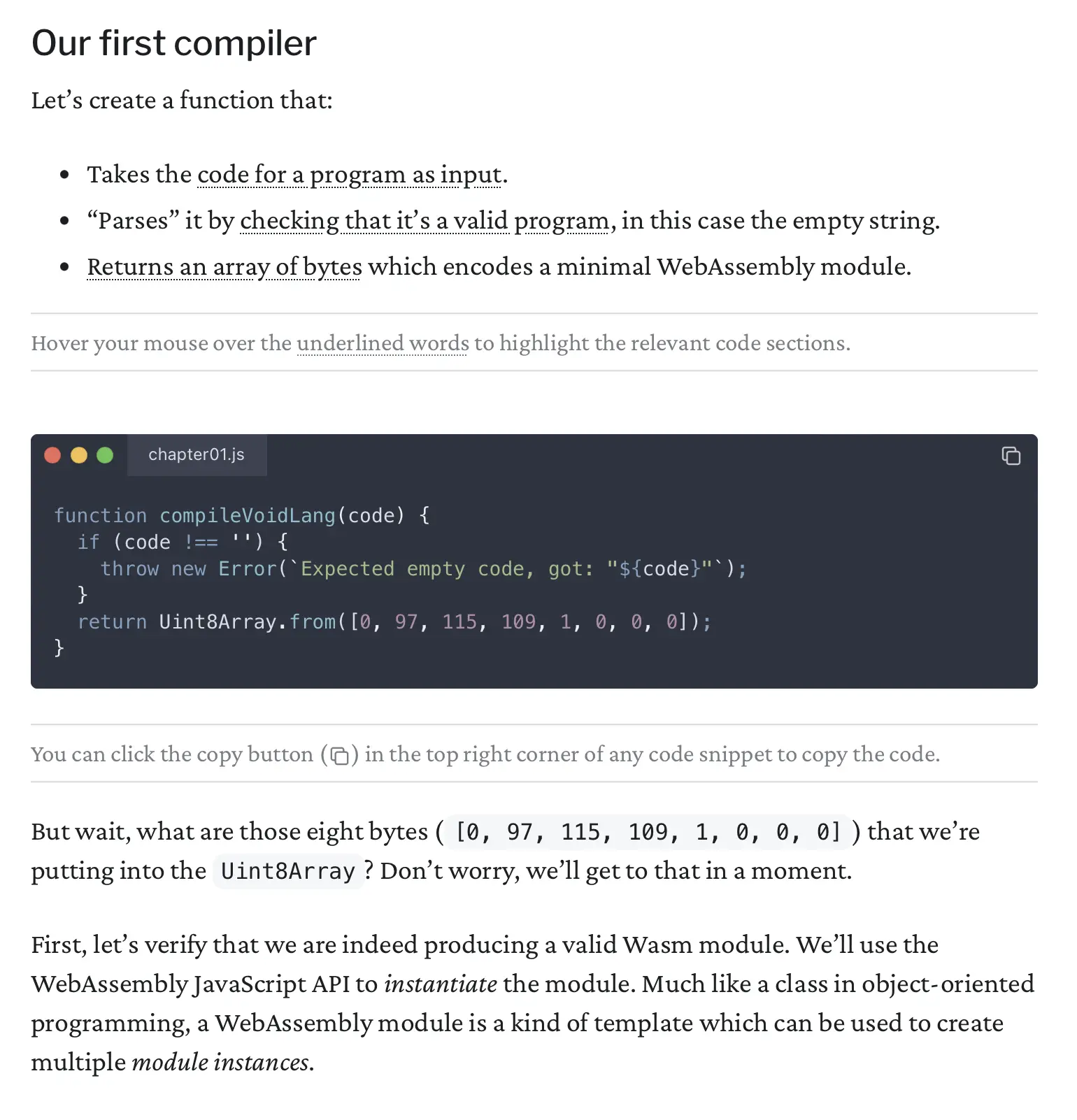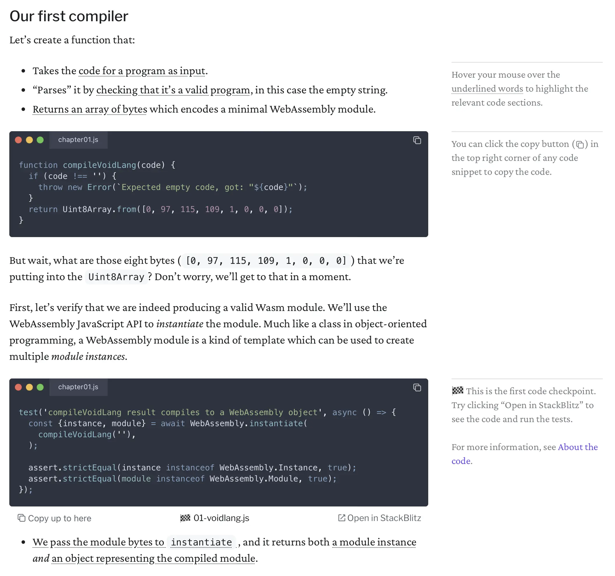 Since WebAssembly is primarily a compilation target, we think the best way to learn the details is by writing a compiler. (Really.)